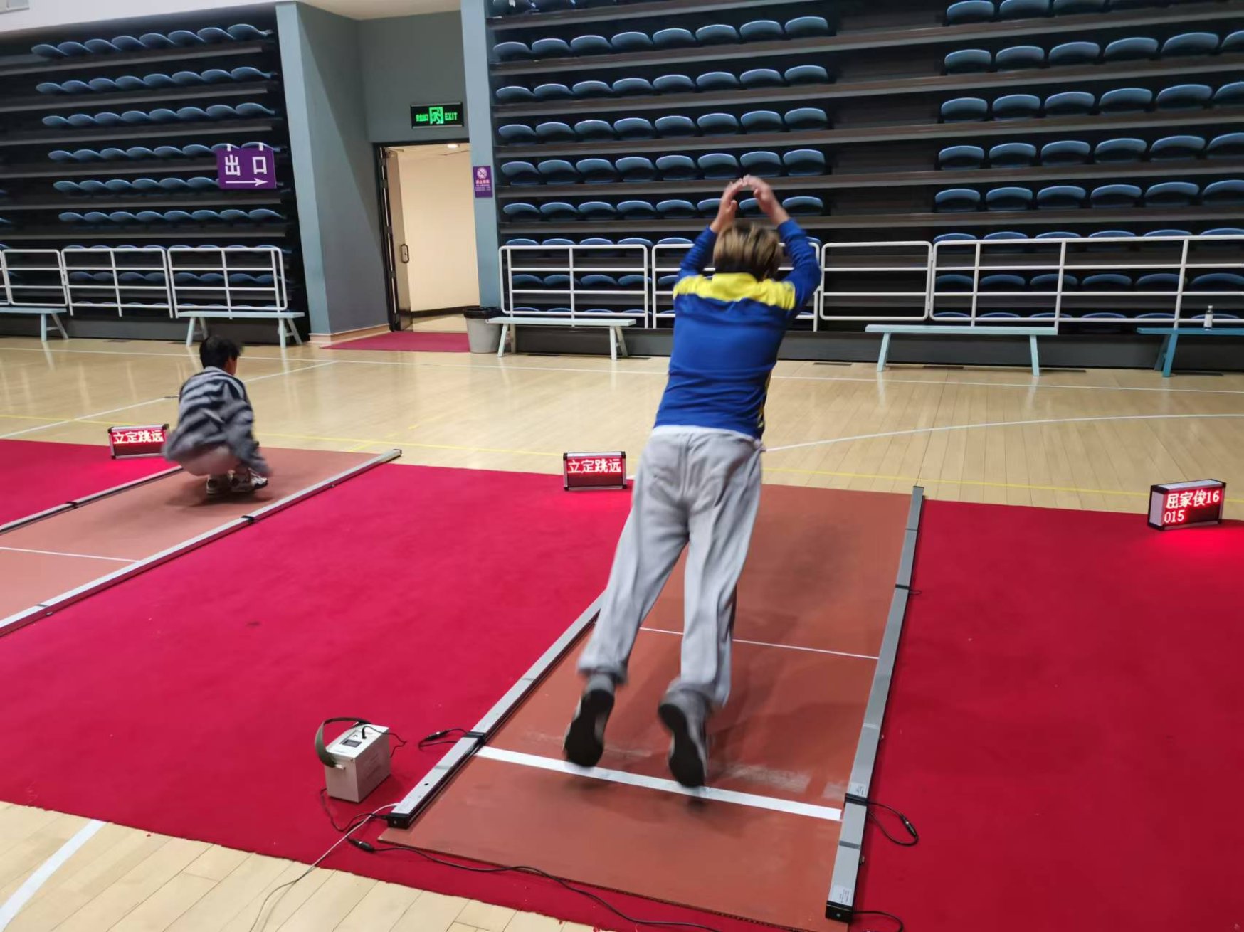 在立定跳远环节中, 选手屈伸前倾,摆臂起跳,向前一跃,充分展现了信息科大学子的拼搏精神和竞技状态。